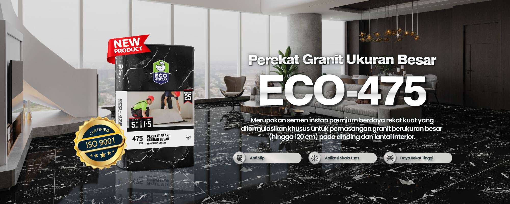 ECO-475 adalah semen instan premium untuk pemasangan granit besar (hingga 120 cm) pada dinding dan lantai indoor. Terbuat dari campuran semen, pasir silika, filler, dan crosslinking polymer. Memiliki daya rekat kuat, tahan lama, dan mudah diaplikasikan. Cukup campur dengan air untuk adukan siap pakai, dan gunakan pada substrat dalam kondisi SSD (Saturated Surface Dry) untuk hasil optimal.